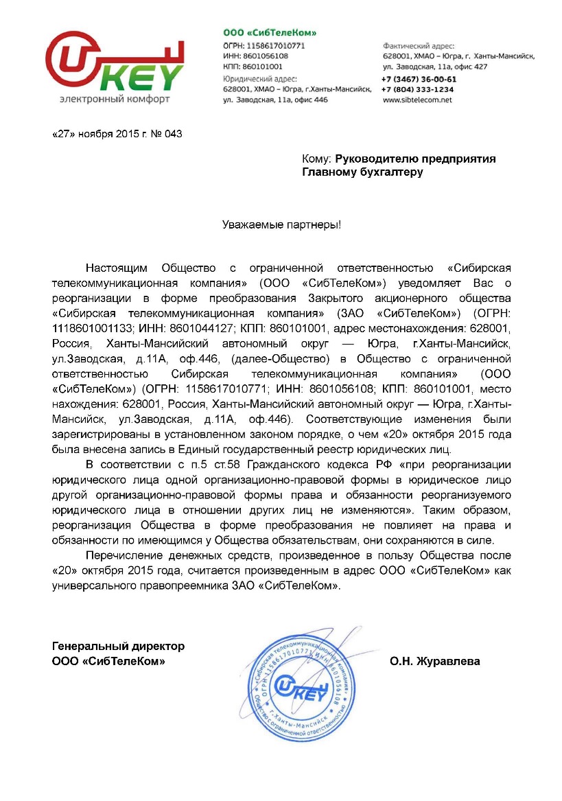 Настоящим Общество с ограниченной ответственностью «Сибирская телекоммуникационная компания» (ООО «СибТелеКом») уведомляет Вас о реорганизации в форме преобразования Закрытого акционерного общества «Сибирская телекоммуникационная компания» (ЗАО «СибТелеКом») в Общество с ограниченной ответственностью Сибирская телекоммуникационная компания» (ООО «СибТелеКом»).